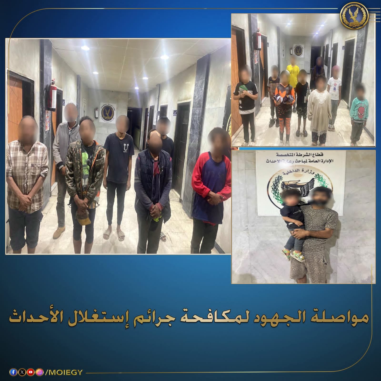 إستمراراً لجهود مكافحة جرائم إستغلال الأحداث .. فقد تمكنت الإدارة العامة لمباحث رعاية الأحداث بقطاع الشرطة المتخصصة من ضبط (9 رجال، 6 سيدات – لـ 10منهم معلومات جنائية) لقيامهم بإستغلال الأطفال الأحداث فى أعمال التسول وإستجداء المارة وبيع السلع بطريقة إلحاحية بنطاق محافظة الجيزة، وبصحبتهم (20 حدث) من المعرضين للخطر حال قيامهم ببيع السلع بشكل إلحاحى والتسول وبمواجهتهم إعترفوا بنشاطهم…